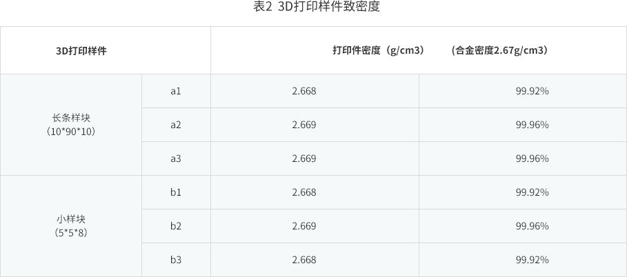 采用排水法對3D打印樣件進行致密度測試。利用高流動性鋁合金粉末打印的不同大小樣件密度差異小、均一性好。
