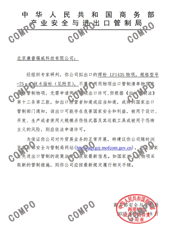 經過我司與商務部及專家組的多次溝通與技術論證,商務部已正式批復:LF143系列低溫焊料被認定為非兩用物項,出口流程大幅簡化,無需額外審批!而傳統SnBi58焊料因技術敏感性被列為兩用物項,每票出口需提交復雜申請,審批周期長達2-3個月,且存在被拒風險,嚴重影響供應鏈穩定性。
