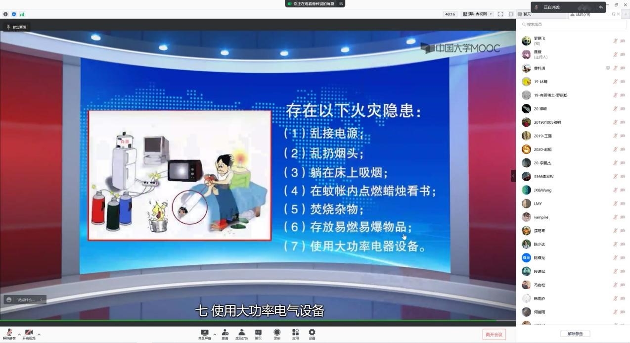 活動(dòng)首先針對(duì)常見的火災(zāi)隱患和消防安全重點(diǎn)部位的火災(zāi)預(yù)防這兩項(xiàng)內(nèi)容,組織觀看了《高校學(xué)生消防安全教育》系列課程視頻,引導(dǎo)在讀研究生們提高消防觀念,加強(qiáng)火災(zāi)預(yù)防意識(shí),排除身邊火災(zāi)隱患,保障人身安全。