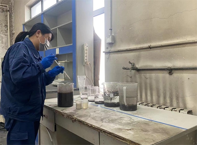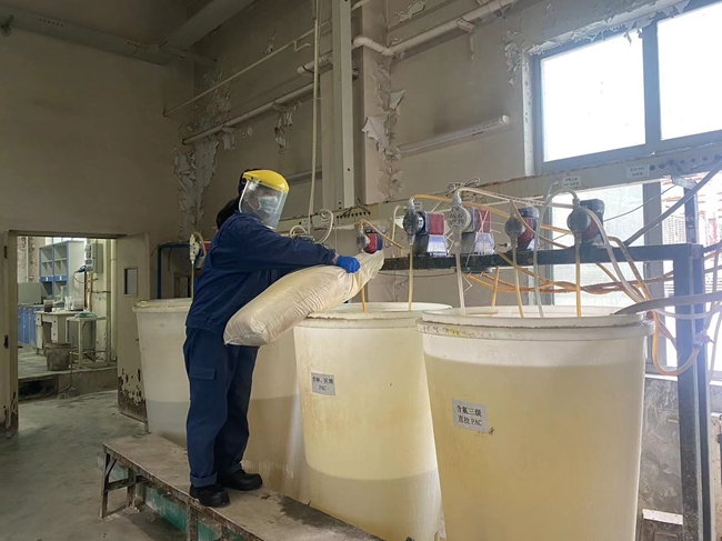 技術人員:污水的變化多種多樣,即使是同一個產線排放的污水,每天的情況都是不同的,這需要技術人員對收集到的污水進行初期分析,調試出配比合適的藥劑,再對污水進行批量處理。通過多年的實驗積累,她能夠做到看水的顏色和狀態分析出所需要添加藥劑的品種和藥量,大大提高了水處理效率。