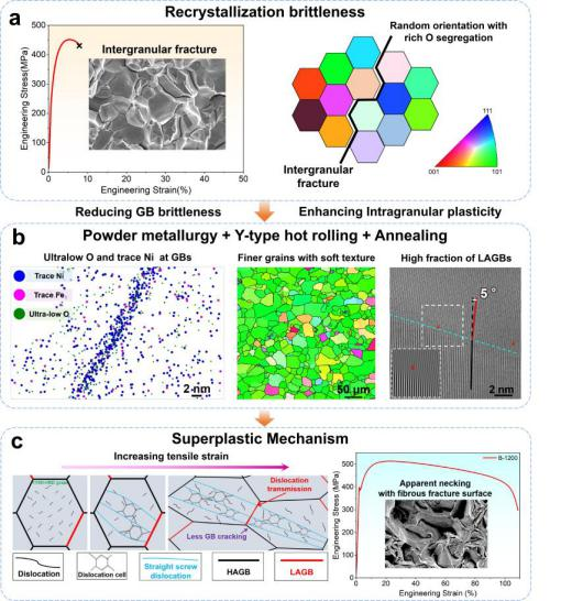 該研究成果由中國有研智能傳感功能材料國家重點實驗室聯合有色金屬制備加工國家重點實驗室,以及浙江大學、南京理工大學等優勢高校共同完成。創新團隊通過粉末冶金、Y型熱軋和熱處理的工藝組合,制備出具有室溫超塑性的完全再結晶純鉬材料。通過在晶界處設計超低氧濃度消除鉬的本征晶界脆性,且與高比例的<110>//RD織構和小角度晶界相結合,實現了晶內位錯網絡的有序演變以及小角度晶界處(≤15°)的位錯穿越。這些因素的協同作用極大抑制了鉬的晶間脆性斷裂傾向,獲得最高108.7%的室溫總延伸率。該發現揭示了難熔金屬室溫超塑性變形的新機制,為制造苛刻應用場景所需難熔金屬及合金提供了理論支撐與可行路線。