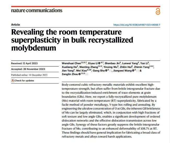 近日,有研工研院在體心立方難熔金屬強韌化方面取得重要進展,所開發的純鉬材料經1000~1700℃超高溫退火后,呈現出獨特的再結晶態室溫超塑性,突破了體心立方難熔金屬再結晶脆性的傳統行業認知。部分研究成果以論文形式發表于國際頂級學術期刊Nature Communications(IF=16.6)(DOI: doi.org/10.1038/s41467-023-44056-7)。