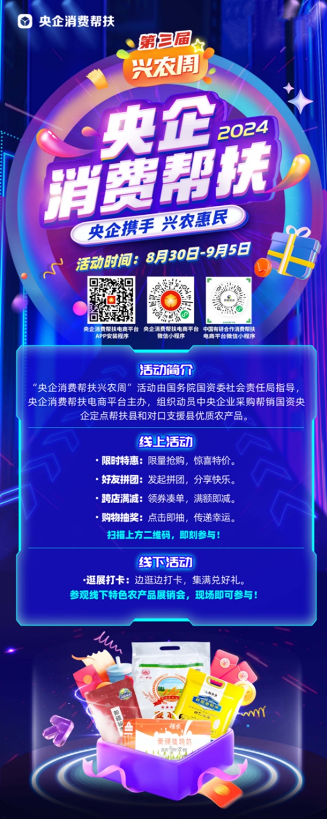 活動以“央企攜手,興農(nóng)惠民”為主題,組織動員中央企業(yè)所屬各單位各部門(特別是工會、食堂)、廣大干部職工、上下游供應(yīng)商和業(yè)務(wù)合作伙伴采購幫扶縣的優(yōu)質(zhì)農(nóng)產(chǎn)品,促進脫貧地區(qū)產(chǎn)業(yè)發(fā)展和脫貧群眾穩(wěn)定增收,鞏固拓展脫貧攻堅成果。