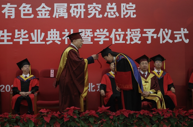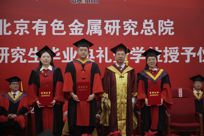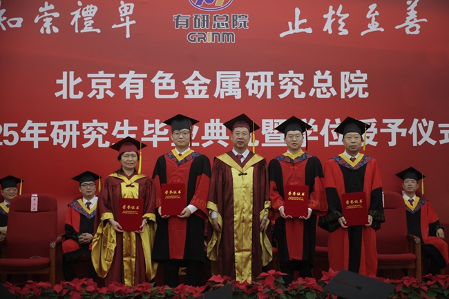 畢業(yè)典禮在國歌聲中拉開帷幕。李志輝首先宣讀了授予趙艷蕓等24名學(xué)生博士學(xué)位、成想等41名學(xué)生碩士學(xué)位的決定。有研總院名譽院長、學(xué)位評定委員會名譽主席屠海令院士,有研總院學(xué)位評定委員會常務(wù)副主席黃小衛(wèi)院士為畢業(yè)生撥穗并頒發(fā)學(xué)位證書。有研總院院長、學(xué)位評定委員會主席趙曉晨為獲優(yōu)秀學(xué)位論文的學(xué)生及其導(dǎo)師、獲院長獎學(xué)金的學(xué)生頒獎。