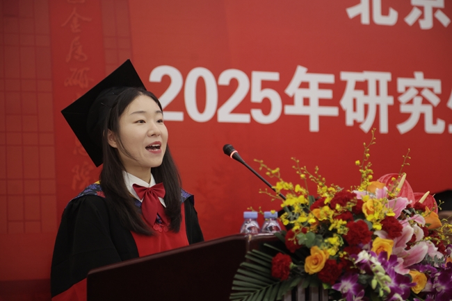 博士畢業(yè)生、一等院長獎學(xué)金獲得者趙艷蕓代表全體畢業(yè)生對總院領(lǐng)導(dǎo)和老師的悉心栽培表達誠摯的感謝。她分享了對有研精神的感悟,表示在未來的道路上,將潛心追尋生命意義、千錘百煉專業(yè)本領(lǐng),做好“新時代有研青年”。