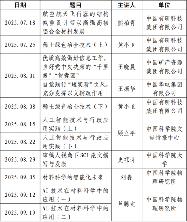 7月以來,“每周學堂”累計舉辦10期,參訓人數逾500人次,培訓內容聚焦專業前沿與實踐技能,涵蓋高強高韌鋁合金材料發展歷程、稀土綠色冶金技術、人工智能賦能材料科學關鍵技術、科技論文與公文寫作等主題,深度融合案例分析與經驗分享,蓄能助推員工業務技能提升,形成全員參與、持續學習的良好生態。