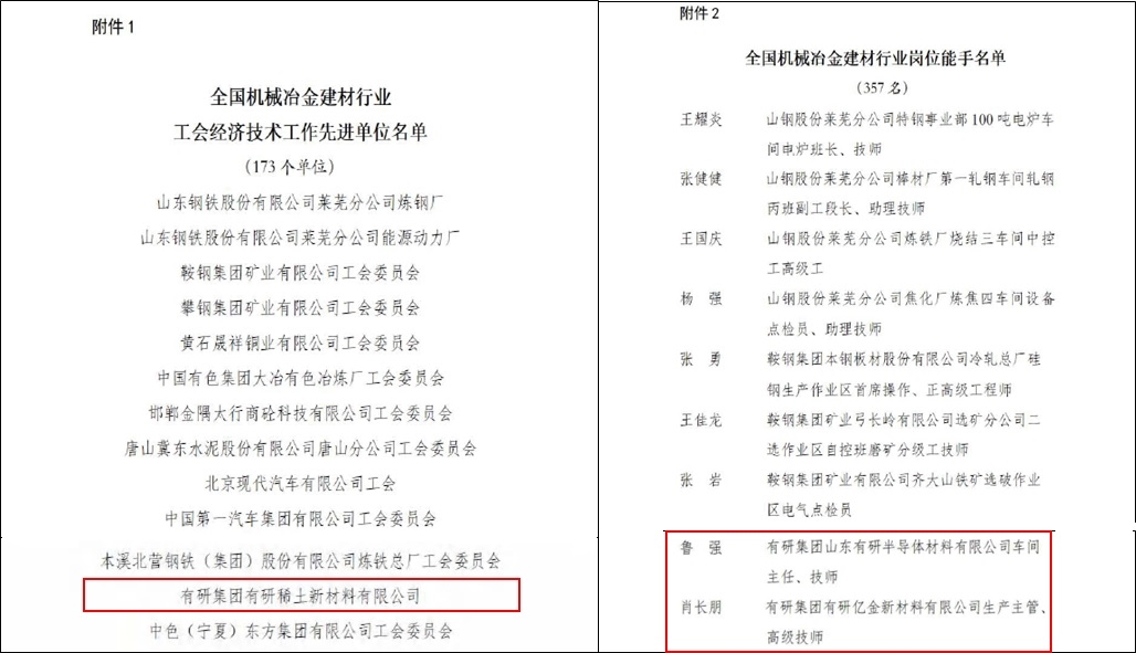 近日,中國機(jī)械冶金建材職工技術(shù)協(xié)會表彰了2022年全國機(jī)械冶金建材行業(yè)工會經(jīng)濟(jì)技術(shù)先進(jìn)單位和崗位能手。有研集團(tuán)有1家產(chǎn)業(yè)單位和2名產(chǎn)業(yè)工人獲此榮譽(yù)。