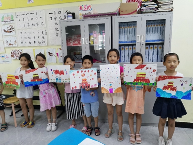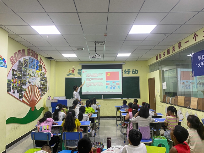 2021年,在建黨一百周年之際,研究生支教團的志愿者們緊隨學黨史的熱潮,圍繞“學黨史、感黨恩、跟黨走”這一主題,給社區的孩子們開展了黨史學習教育,包括專題思政課、慶祝建黨一百周年繪畫課、《我和我的祖國》觀影活動。思政課上研究生支教團與同學們一同回顧了慶祝中國共產黨成立100周年大會,認真學習了習近平總書記重要講話、共青團員與少先隊員代表致辭,習近平總書記的講話讓大家感受到由衷的自豪感,也讓孩子們暗暗許下了“請黨放心,強國有我”的誓言。隨后進行了先進人物事跡的講述,讓孩子們感受共產黨員全心全意為人民服務的高貴品格,引導他們從小樹立報效祖國服務社會的崇高理想信念。最后帶領他們學習黨旗、黨徽、國旗的組成元素與含義,了解五四青年節、七一建黨節、國慶節等,進一步傳承和弘揚中國共產黨優秀的紅色文化,讓孩子們感受黨的光榮傳統中蘊含的智慧與精神。