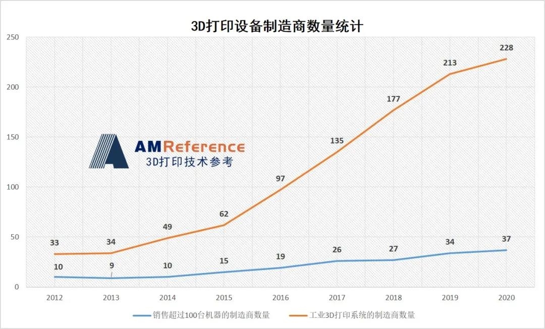 近年來,3D打印設備制造商的數量增長迅速。下圖的頂部線顯示了工業3D打印系統的制造商數量。2020年,全球有228家制造商生產和銷售工業3D打印系統(價格高于5000美元),與2019年相比,增加了15家;自2012年以來,工業系統制造商的數量增長了近7倍。底部線顯示了每年至少銷售100臺機器的制造商數量,這意味著2020年有37家公司的工業3D打印系統銷量超過了100套。