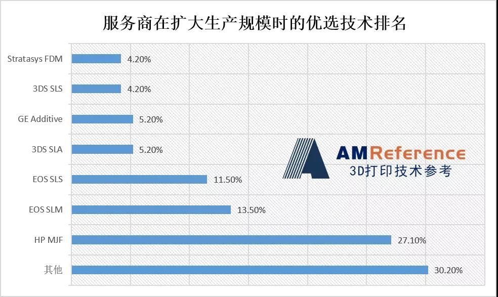 除此之外,服務商們認為惠普的MJF技術盈利能力最強,因此也成為在擴大生產能力時首先選擇的技術類型和品牌;其次是EOS的SLM技術,EOS的SLS技術和3D Systems的SLA技術緊跟其后。另一方面,服務商通常會選擇技術成熟的機器類型,但2020年由服務商購買的404臺設備中,有312臺打印機來自非頂級品牌,這一比例相比2019年的41.4%提高很多,這也意味著其他品牌正在逐步獲得市場認可。