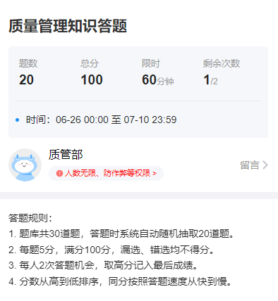 本次知識競賽采取線上答題方式,競賽組包括一線部門和管理部門組,按參與人數的前20%取一、二、三等獎,獨立評定。